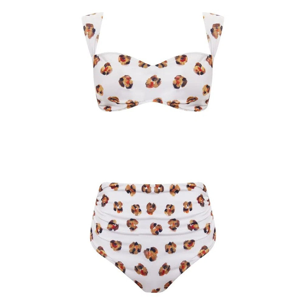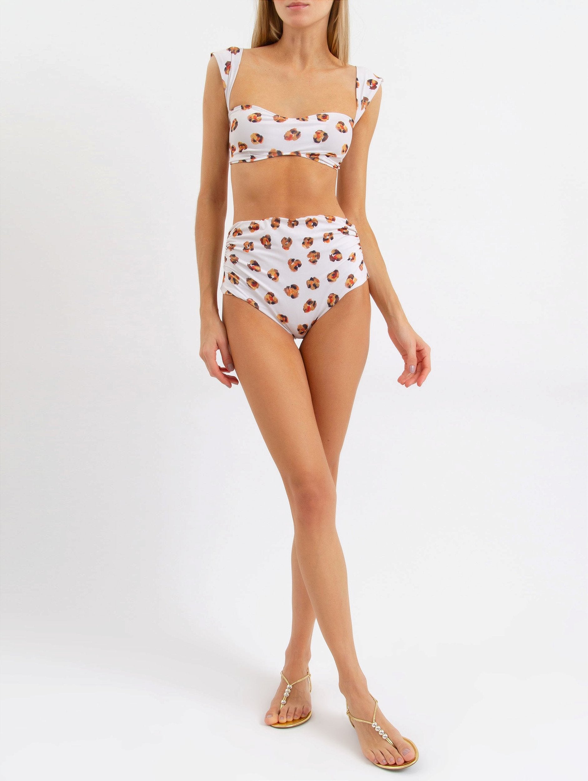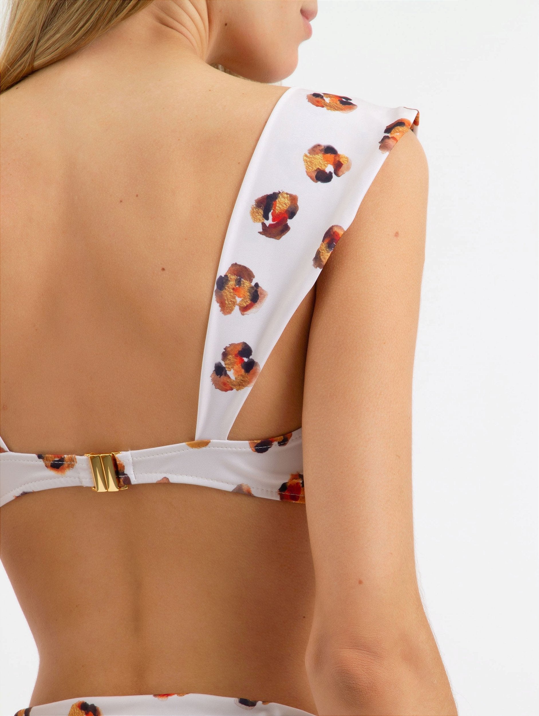Biquíni Nicole. Composto por duas peças: top com alças largas, bojo removível e fechamento por fivela de encaixe dourada; bottom com modelagem hot pant e detalhe em Vincos.